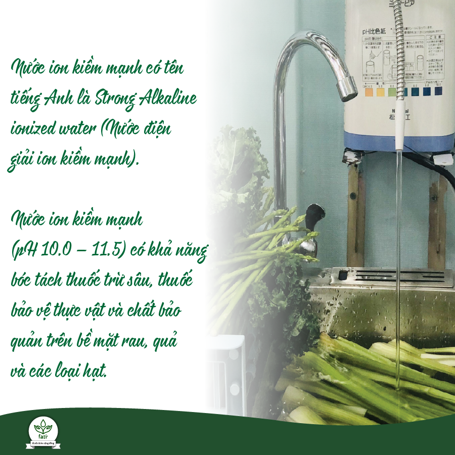 Nước ion kiềm mạnh có tên tiếng Anh là Strong Alkaline ionized water (Nước điện giải ion kiềm mạnh). Nước ion kiềm mạnh (pH 10.0 – 11.5) có khả năng bóc tách thuốc trừ sâu, thuốc bảo vệ thực vật và chất bảo quản trên bề mặt rau, quả và các loại hạt. Nhờ đó mà khi rửa rau bằng nước ion kiềm mạnh sẽ làm giảm đáng kể lượng thuốc trừ sâu, chất bảo quản bám trên rau củ quả."