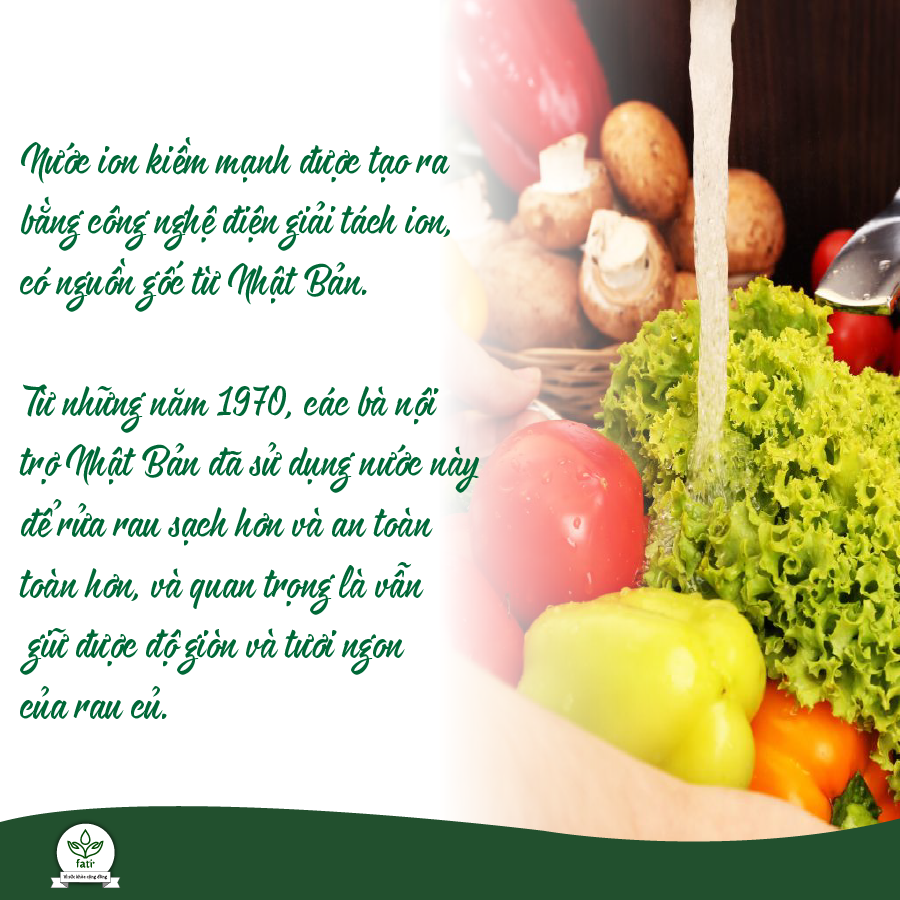 Nước ion kiềm mạnh được tạo ra bằng công nghệ điện giải tách ion, có nguồn gốc từ Nhật Bản. Từ những năm 1970, các bà nội trợ Nhật Bản đã sử dụng nước này để rửa rau sạch hơn và an toàn toàn hơn, và quan trọng là vẫn giữ được độ giòn và tươi ngon của rau củ.